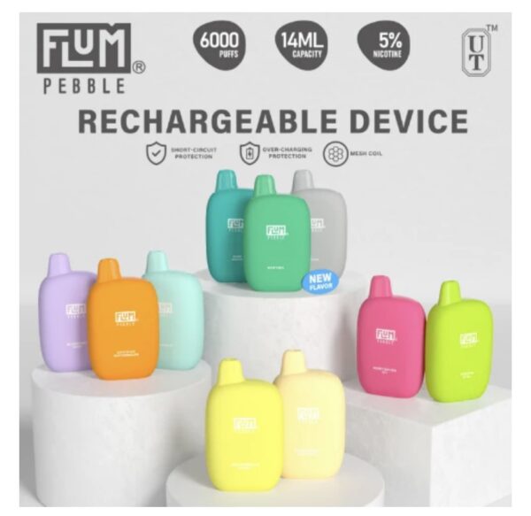 FLUM introduces the FLUM Pebble, a 6000 puffs rechargeable disposable vape from one of the most popular disposable manufacturers thus far. The FLUM Pebble packs in 14ml of vape juice at 5% nicotine, paired with a mesh coil for ultimate flavor and vapor delivery. Powering the Pebble is a 600mAh internal battery which is rechargeable via USB-C.
